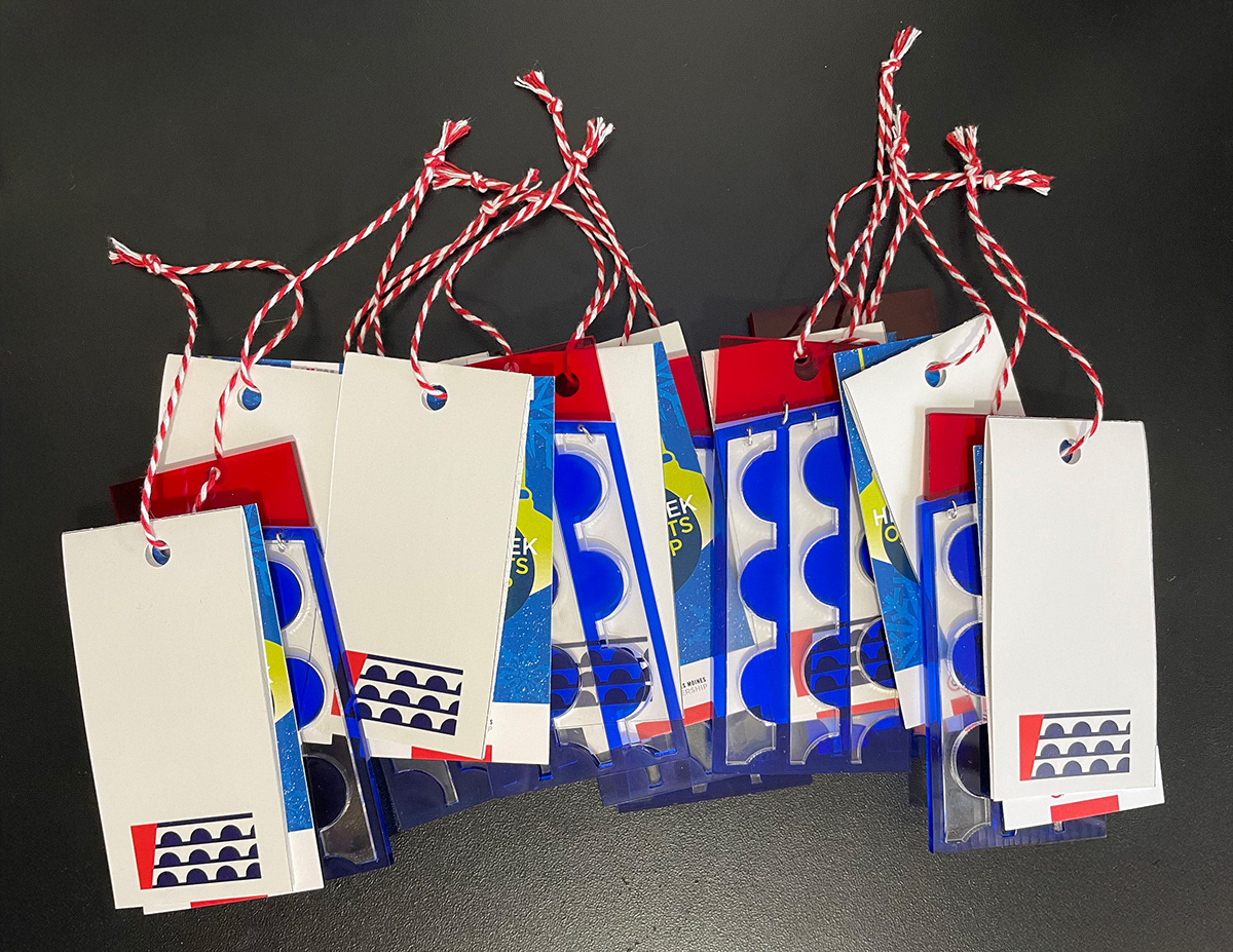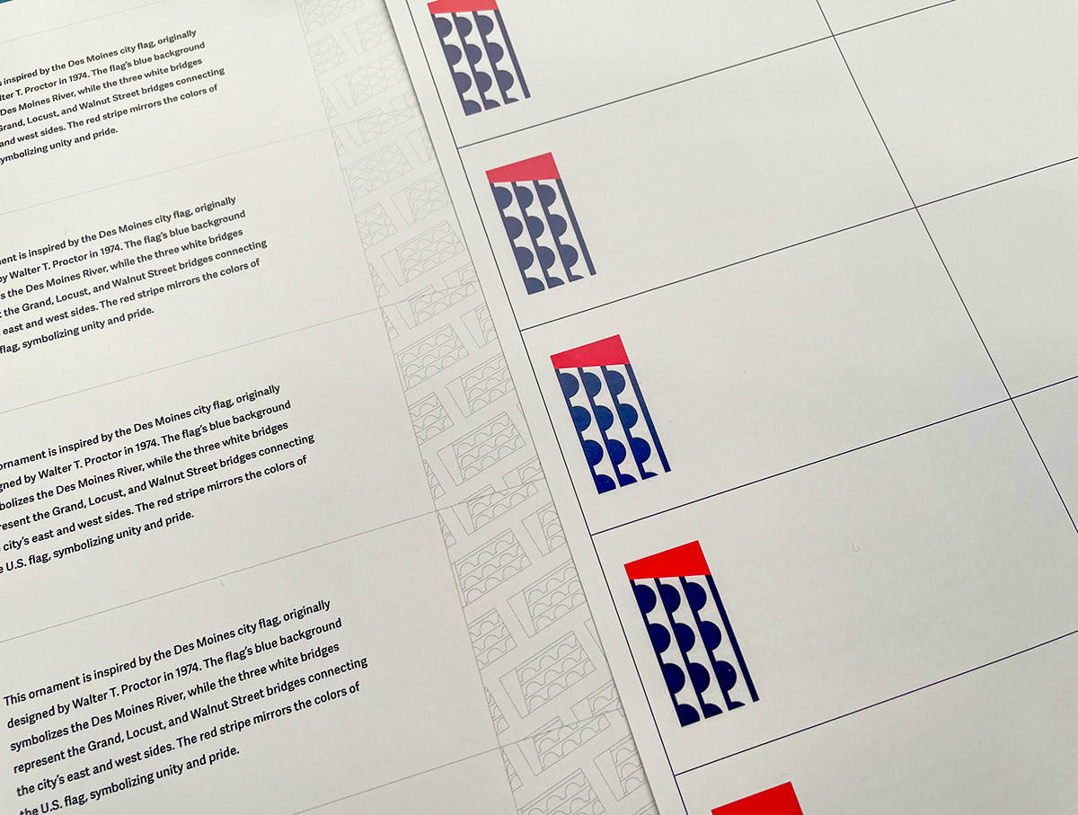 For this project, I collaborated with the Greater Des Moines Partnership as a featured artist for their annual "Hide & Seek Ornaments You Keep" project. I designed a durable acrylic ornament that doubles as a keychain, carefully selecting the size to ensure versatility and practicality. I chose the Des Moines flag for the design, as it is not widely recognized, and I aimed to reintroduce this meaningful symbol to the community. I admired the flag's design by Walter “Bud” T. Proctor, which symbolizes the three bridges of Des Moines—Walnut, Locust, and Grand Street bridges—connecting the city's downtown ecosystem. Proctor’s red, white, and blue design reflects the central features of the city, particularly the Des Moines River, and highlights the city's interconnectedness. Additionally, I created an informative label to accompany the ornament, explaining its purpose, the flag's design, its symbolism, and crediting its original designer, to enhance public awareness and appreciation for this iconic piece of local history.